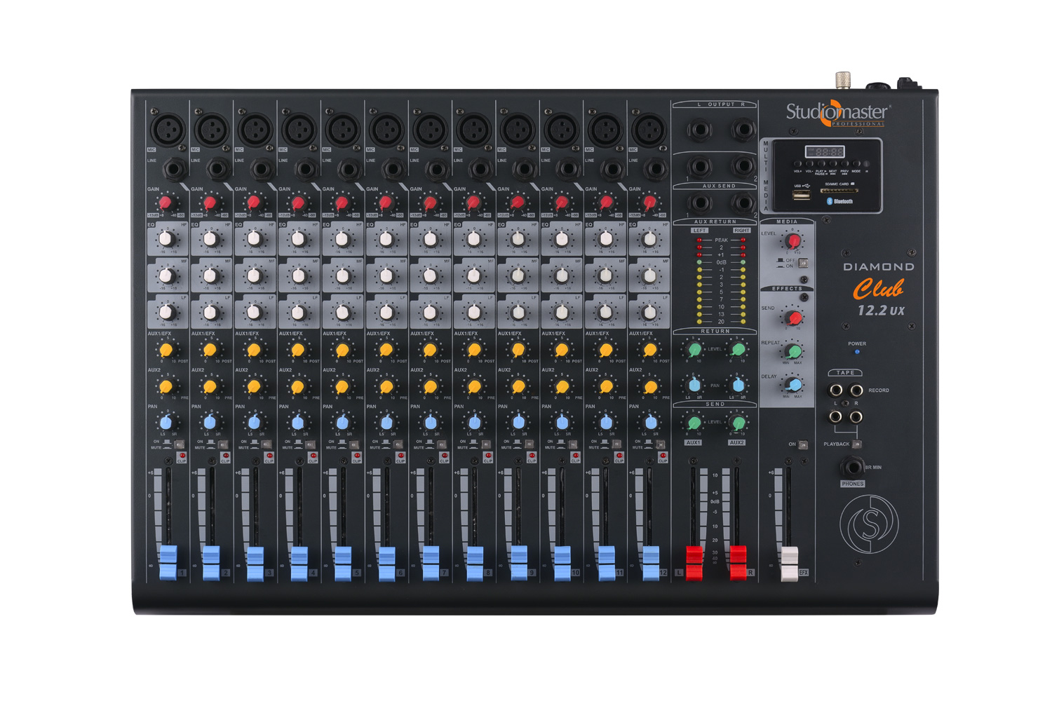 ? 12 mic / line + USB / SD card input for MP3 music playback with IR remote control. ? Built-in Bluetooth wireless streaming from smartphones, tablets and laptops. ? High-quality on-board delay EFX with time and repeat control. ? 2 Aux sends / returns. ? 1 pre & post aux sends rotary control per channel. ? Balanced mic / line input. ? Gain control with 3 band EQ per channel. ? L/R pan pot, illuminated mute switch & clip LED per channel. ? Stereo tape in / tape out and ?? headphone out. ? Balanced ?? TRS L/R master output. ? 12 segments L/R LED meter for master level output.